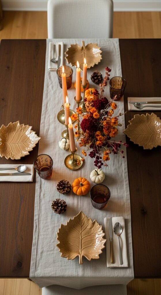 - Mini pumpkins, gourds, and pine cones scattered naturally along the runner as informal table decoration