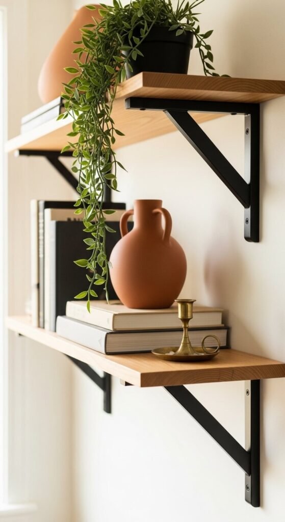 - Black shelving brackets exposed on floating shelves