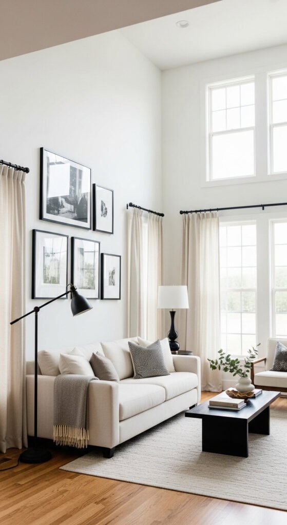 The balance rule: For every black element you add, ensure a warm, natural material is visible in the same eyeline — a black curtain rod with warm linen panels, a black coffee table with a natural wood tray on top, a black gallery wall above a camel linen sofa.