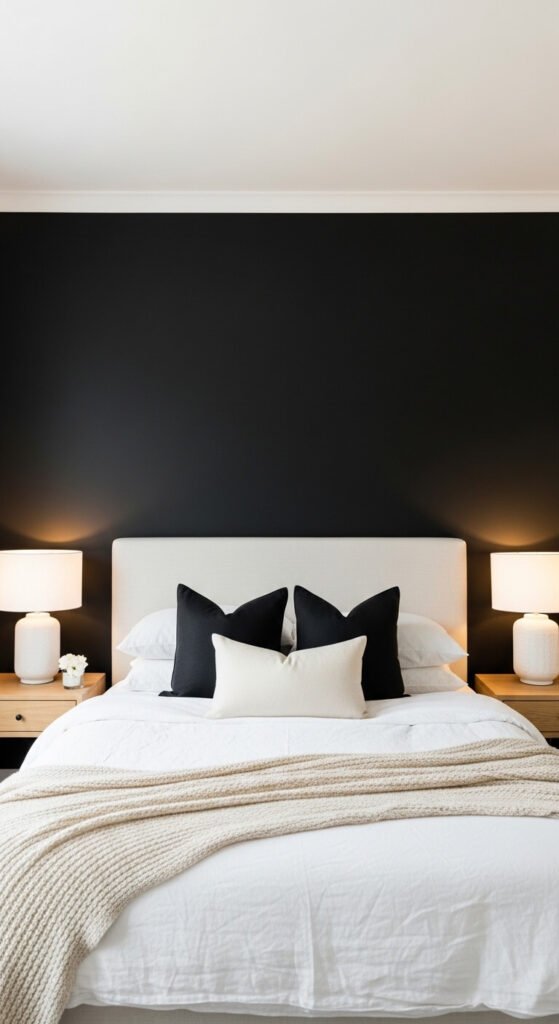 - Behind the bed — the most popular black accent wall placement. It frames the headboard, makes the bed feel like the room’s architectural centerpiece, and looks genuinely luxurious against white or cream bedding.
