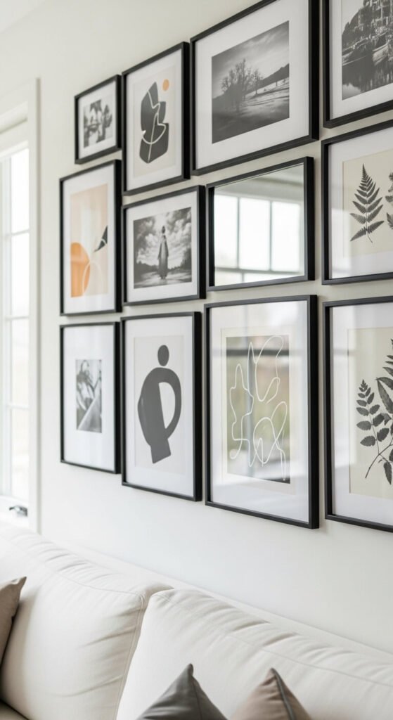 - Use identical frames — the same thin matte black profile across all sizes creates cohesion. Mix frame widths and the effect becomes fragmented rather than unified.