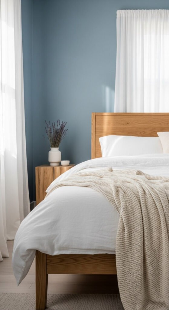 - Dusty blue, powder blue, or French blue on the walls for a serene, sleep-friendly atmosphere
