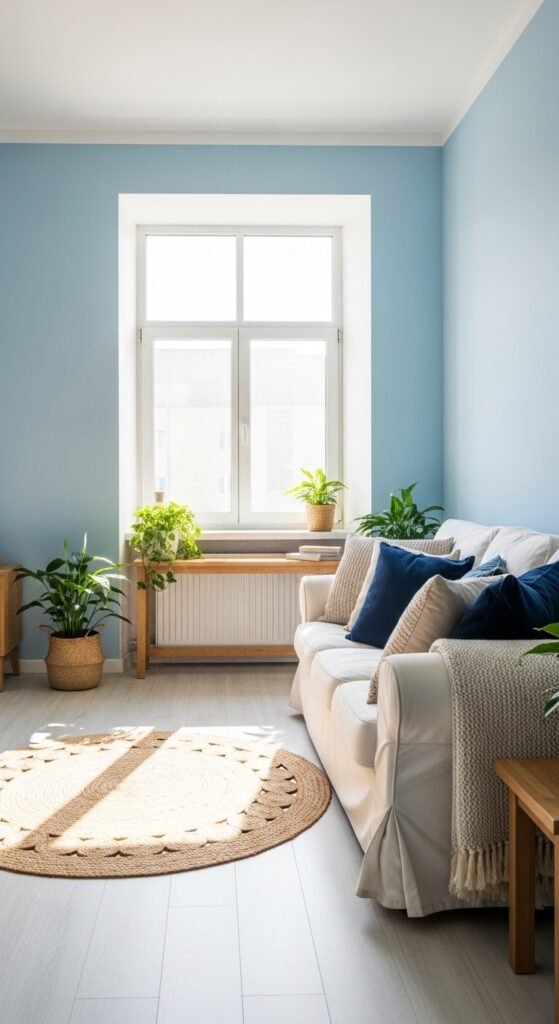 - Powder and sky blue — the most soothing and airy of the family; makes rooms feel larger and lighter, perfect for smaller spaces