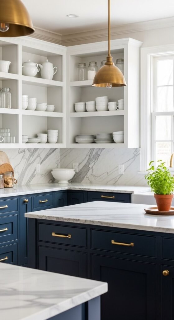 - Navy lower cabinets paired with white uppers and brass hardware is a kitchen combination that never goes out of style