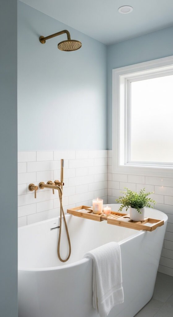 - A powder blue ceiling in a bathroom creates a sky-like effect that feels unexpectedly serene
