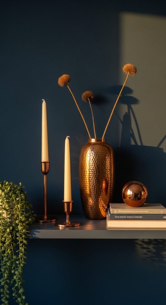 - Copper geometric sculptures or abstract objects — these add personality and visual interest to a shelf or table without requiring a specific function