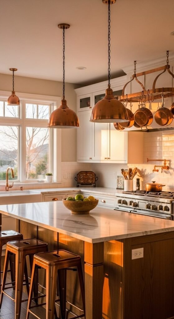 - Copper pendant lights above an island or dining table — one of the single most transformative copper introductions; the warm glow of copper lighting makes food look better and dinner feel more like an occasion