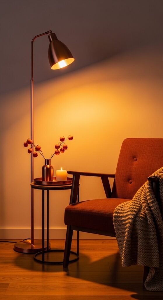 - Copper table or floor lamp — a slim copper lamp base beside a sofa or armchair adds warmth to the corner without dominating the room