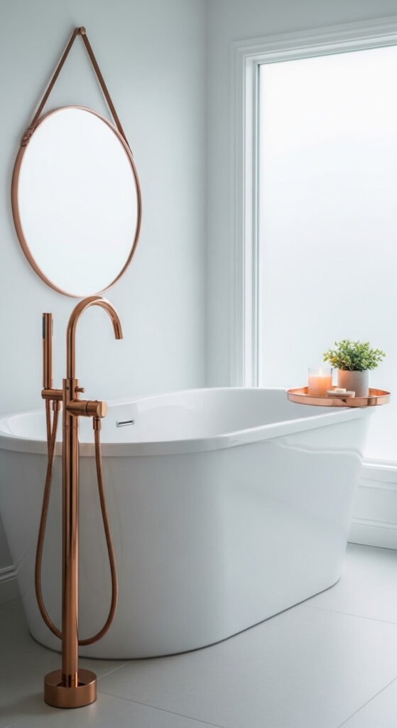 - Copper faucets and fixtures — one of the most luxurious-feeling copper applications; a copper tap above a white sink feels genuinely spa-like