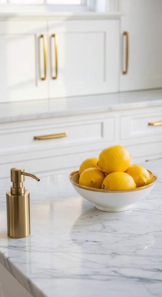 - Tray and bowl styling — a brass tray on a coffee table or kitchen island grounds a vignette with warmth