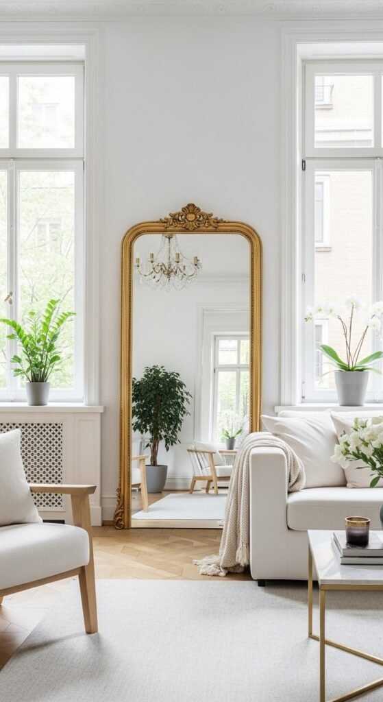 The key is positioning: the mirror should catch the window’s reflection when you’re standing in the room’s main viewing area. Don’t just hang it on any opposite wall—make sure it’s actually capturing and reflecting that precious natural light.