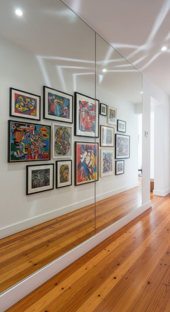 The reflective surfaces break up the wall’s flatness and catch light from different angles throughout the day. This creates a dynamic, ever-changing display that static art alone can’t achieve.