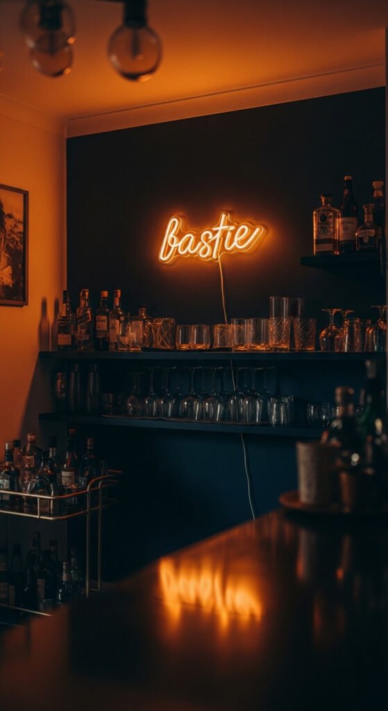 - Behind a bar cart or drinks station — one of the most popular and most successful neon placements in any home
