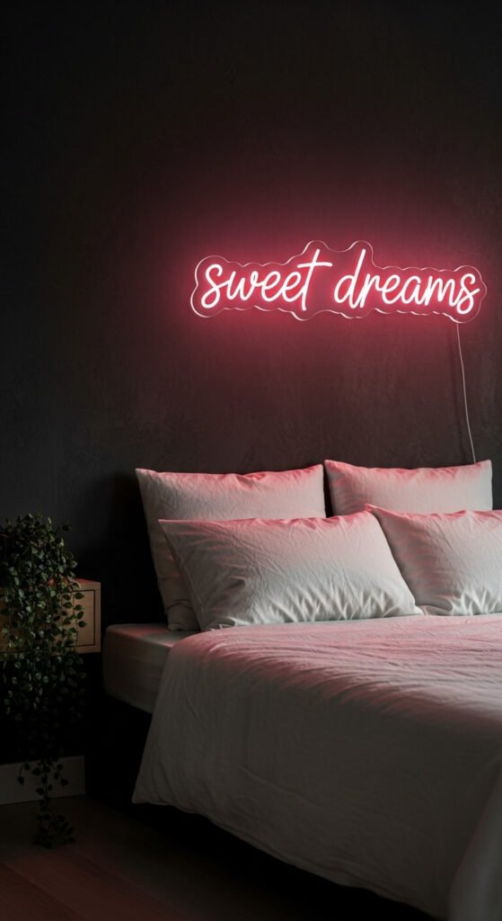 - Warm ambient lighting — floor lamps, table lamps, and candles all complement neon’s glow and prevent the sign from looking like the only light source in a dark room
