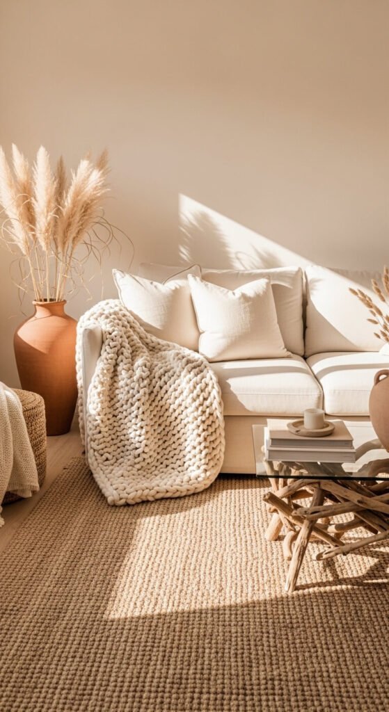 A room with a linen sofa, a wool throw, a jute rug, a rattan side table, and a chunky knit pillow reads as rich and layered — even if every single item is the same shade of oatmeal. Your eye picks up on the differences in how each material catches and holds light.