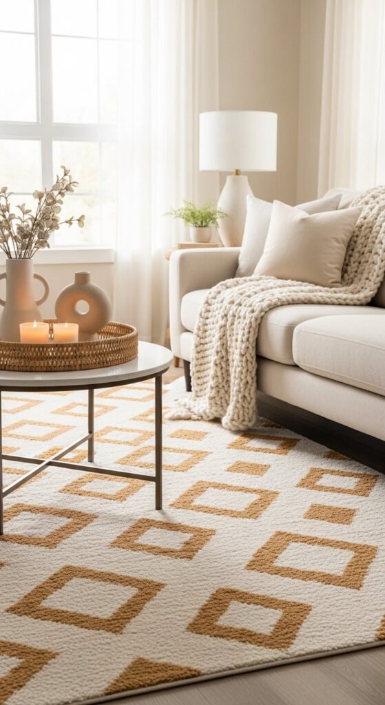 A cream and white striped pillow, a subtle grid linen curtain, a faint geometric rug in ivory and sand — these add visual rhythm without breaking the palette. One or two patterned pieces per room is usually enough to prevent the space from reading as plain.
