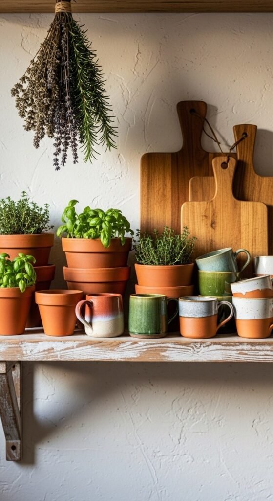 - Unglazed ceramic and clay pottery — the most natural companion to terracotta tones