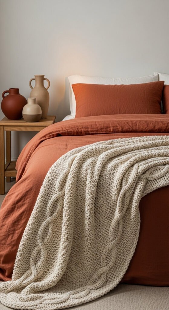 Start with one anchor piece — a terracotta linen duvet, a rust-toned area rug, or a set of velvet cushions. From there, layer in complementary tones like: