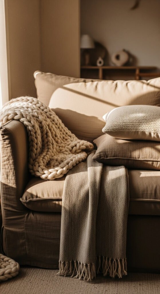 - One neutral anchor throw — cream, oatmeal, warm grey, or soft white. This is your most versatile piece and the one you’ll reach for most.