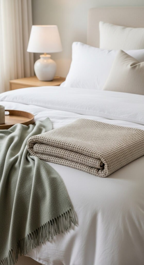 - Summer — open-weave cotton or a light muslin throw in warm white or sun-bleached natural tones