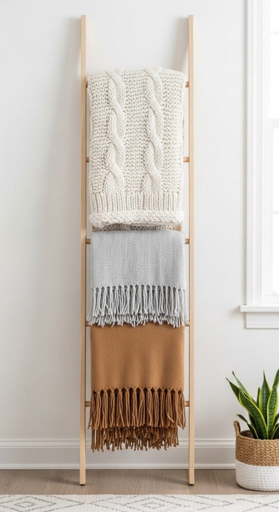 - A storage ladder — a simple wooden blanket ladder hung with two or three throws is one of the easiest, most stylish storage solutions in any living room or bedroom