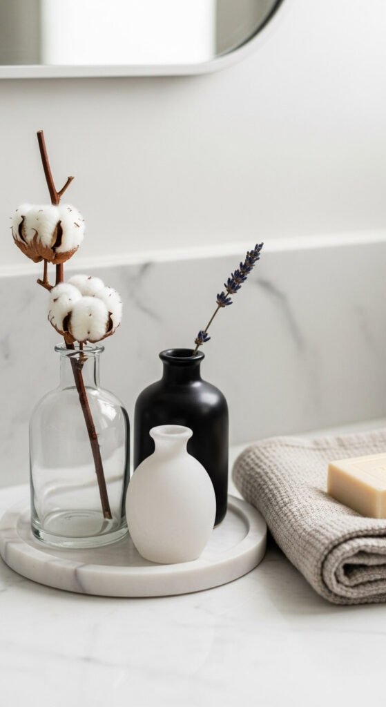 - Use a tray to anchor the group — a small marble, wooden, or ceramic tray underneath a vase grouping ties it together and signals that the arrangement was deliberate.