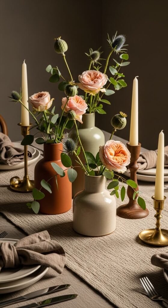 - Dining table centerpiece — one large vase or a loose grouping of three at varying heights. Keep them low enough to see over during a conversation.