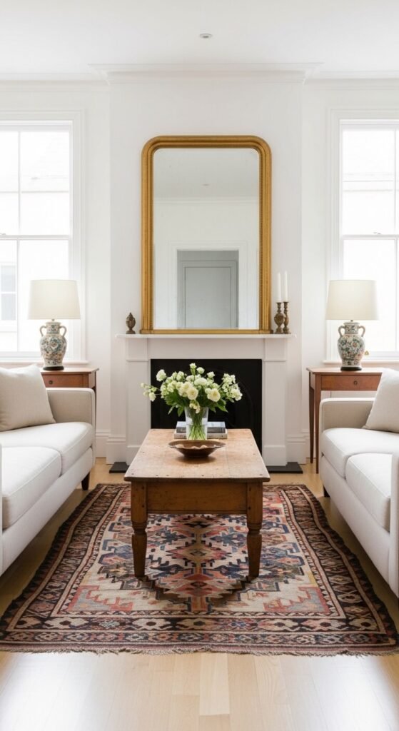 - A vintage rug with a strong pattern — a Persian, kilim, or Moroccan that defines the floor plan