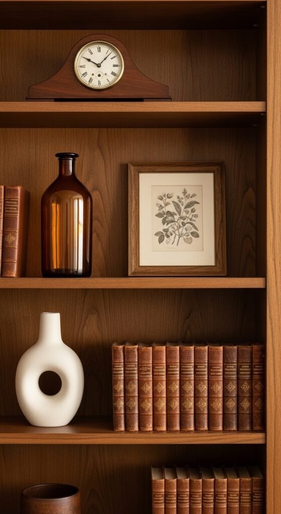 - Keep only those that belong to a coherent color palette or material story — warm wood tones, aged metals, terracotta and cream ceramics, or jewel-toned glass