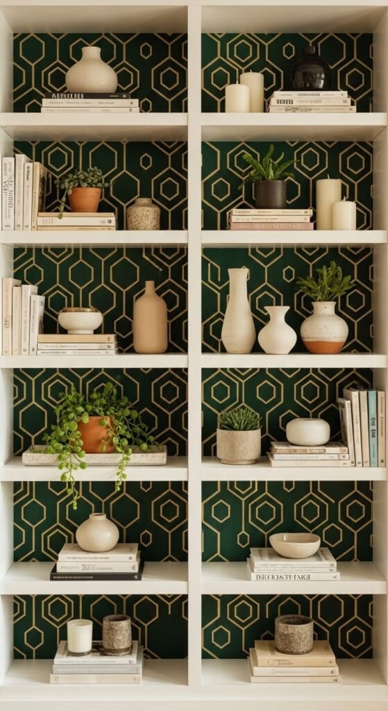 - The back panels of an open bookcase — wallpaper the back wall of each shelf in a pattern that contrasts or complements the items displayed in front of it; the effect is layered, rich, and completely intentional-looking