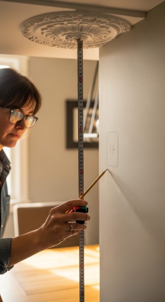 - Have a helper hold the chandelier at that height while you step back and look at it from across the room. This simple step saves so many headaches — seeing it in place before committing is everything.
