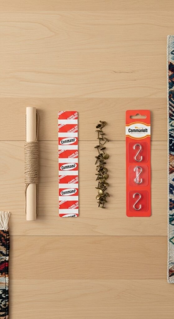 - Velcro strips — one side adheres to the wall, the other to the fabric; particularly effective for lightweight tapestries because the full-width contact keeps the top edge perfectly flat