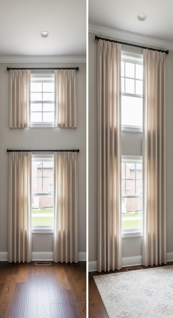 No other single decorating change — not a new rug, not fresh cushions, not a gallery wall — produces as immediate and dramatic a visual impact as moving curtain rods from just-above-the-window to ceiling height.