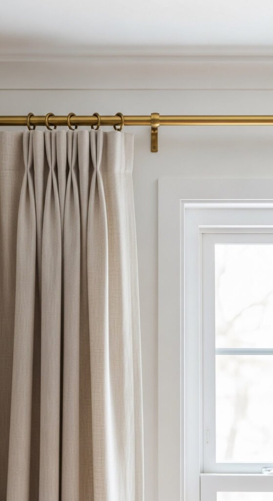 - Curtains that are too short for the ceiling-height rod — buy longer panels and hem them rather than living with the wrong length