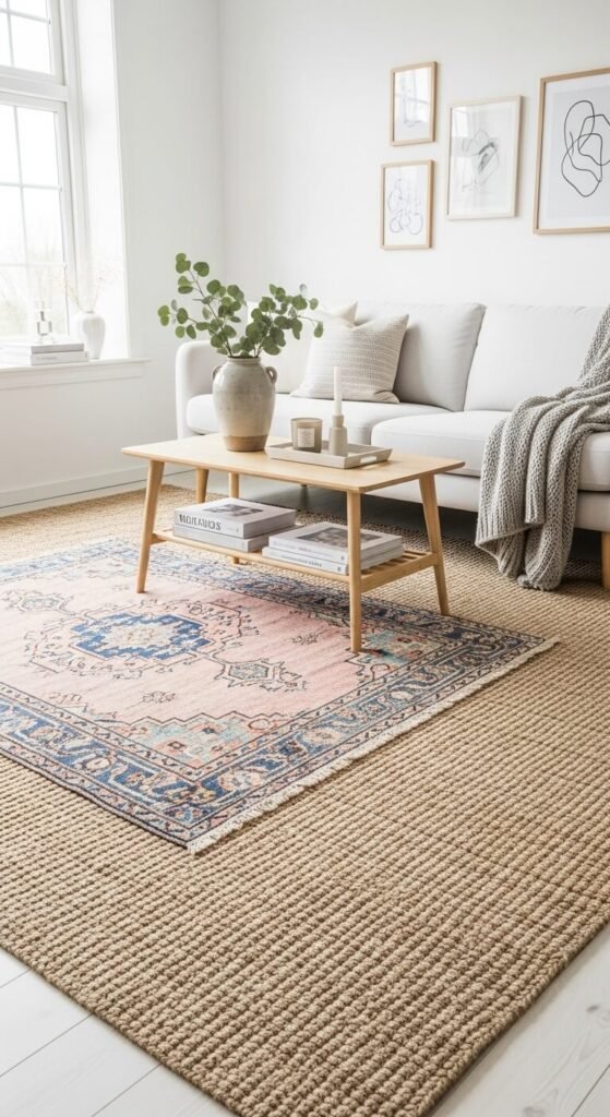 Size matters here: Your base rug should extend beyond your furniture arrangement. For living rooms, this typically means 8×10 feet or larger. It should peek out from under your layered rug on all sides, creating a frame effect.