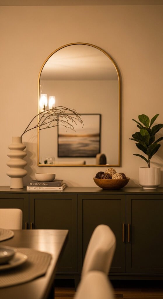 Whatever you choose, make sure it’s proportionate. The artwork or mirror should be roughly two-thirds the width of the credenza to feel balanced rather than lost or overwhelming.