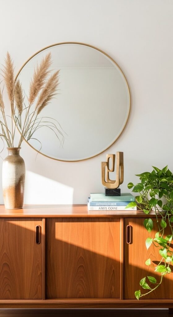 One of the single most transformative things you can do for a credenza is hang something on the wall directly above it. A mirror or a piece of artwork instantly elevates the entire vignette from “surface with stuff on it” to a fully composed, intentional moment.