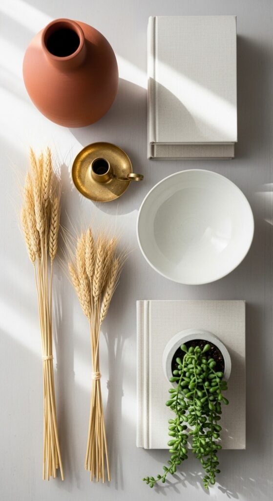 - Ceramic + brass + natural fiber — a glazed vase, a gold object, and a woven basket create warmth with sophistication