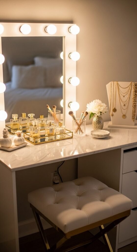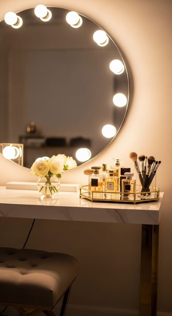 - A small table lamp on one end of the vanity adds ambient warmth and personality even when the main makeup light isn’t in use