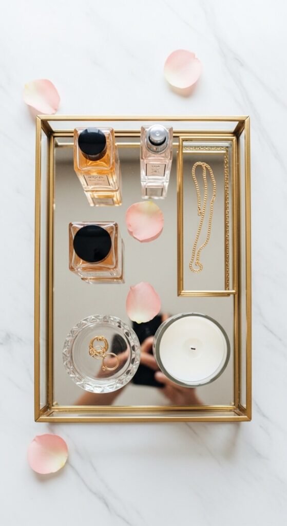 - A tray as the anchor — a mirrored tray, marble tray, or lacquered tray on the main surface corrals the items you reach for most frequently and makes the arrangement look intentional rather than scattered