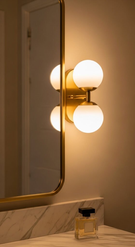 - If you don’t have a Hollywood mirror, flank your existing mirror with two matching wall sconces at face height — this replicates professional lighting perfectly