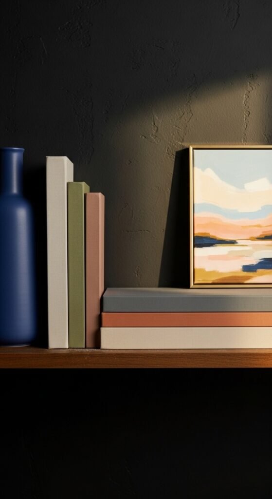 Layer 1: Backdrop Items (large, substantial pieces) These anchor your shelf and provide visual weight. Think: stacks of books, large vases, boxes, or artwork leaning against the back wall.
