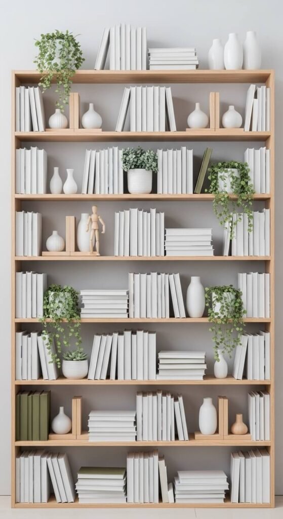Professional stylists use a trick called rhythmic repetition—repeating certain elements throughout your shelves to create cohesion.