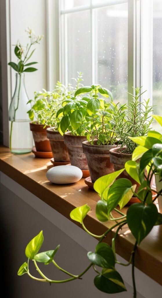 Let something trail or spill: A trailing plant that drapes over the edge of the sill connects the arrangement to the room below and softens the hard line of the ledge. It’s the detail that makes a windowsill look styled rather than simply stacked.