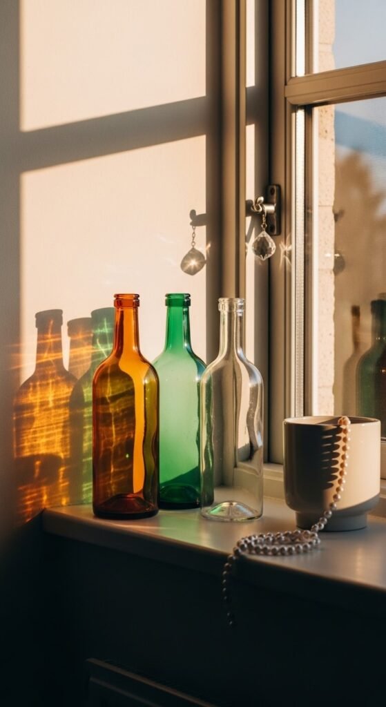 - Colored or clear glass bottles and vessels — scatter colored light across nearby walls and surfaces when the sun shines through them directly