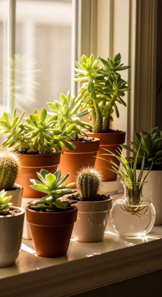 Layer depth when the sill allows: On a deeper sill, place taller items toward the back and smaller items toward the front. That sense of layered depth makes the arrangement look lush and considered from across the room.